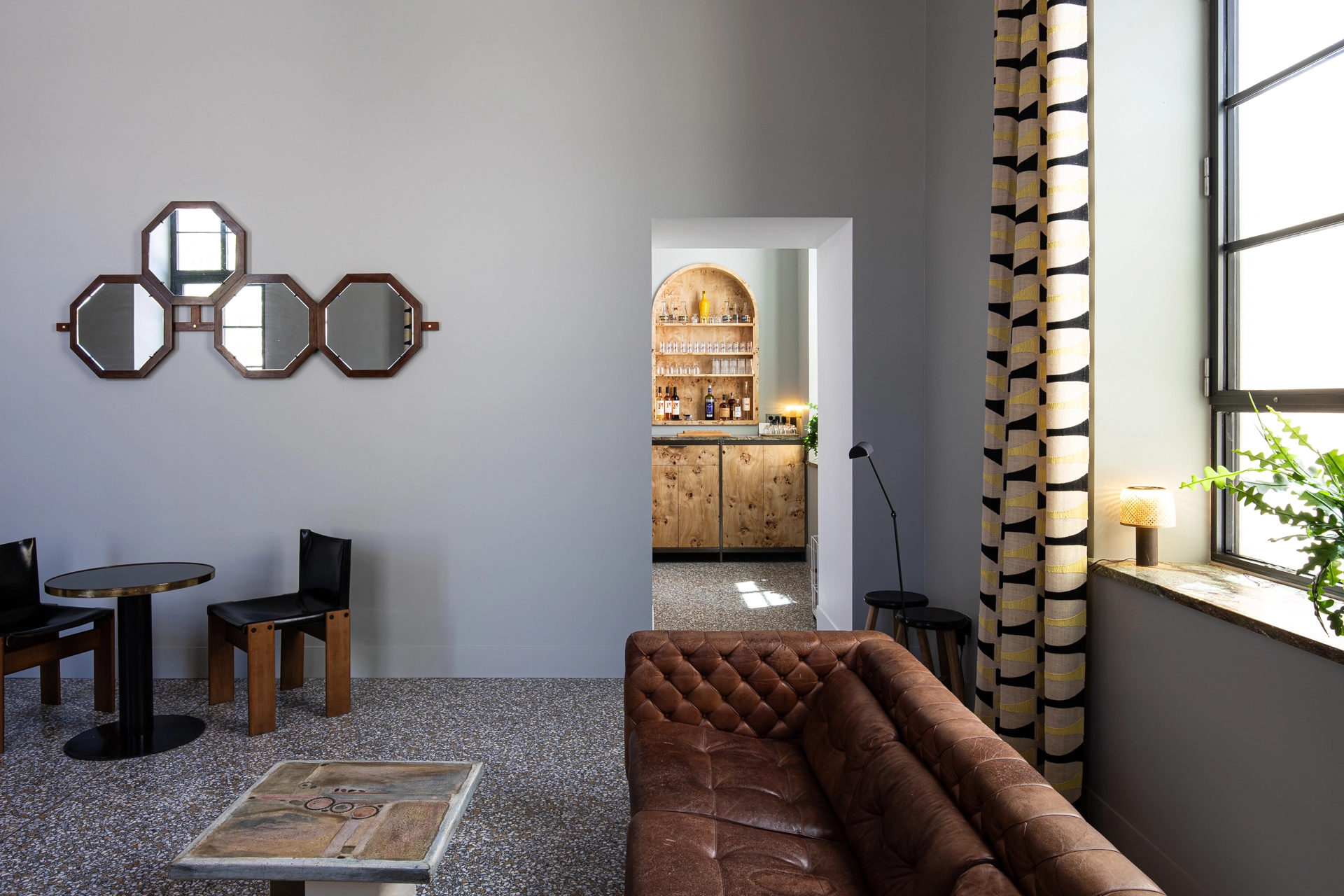 At the heart of the lounge, the Honesty Bar invites you to slow down. Help yourself and enjoy your drink as conversations unfold or silence settles in. The materials and carefully selected objects contribute to this moment of quiet pause.